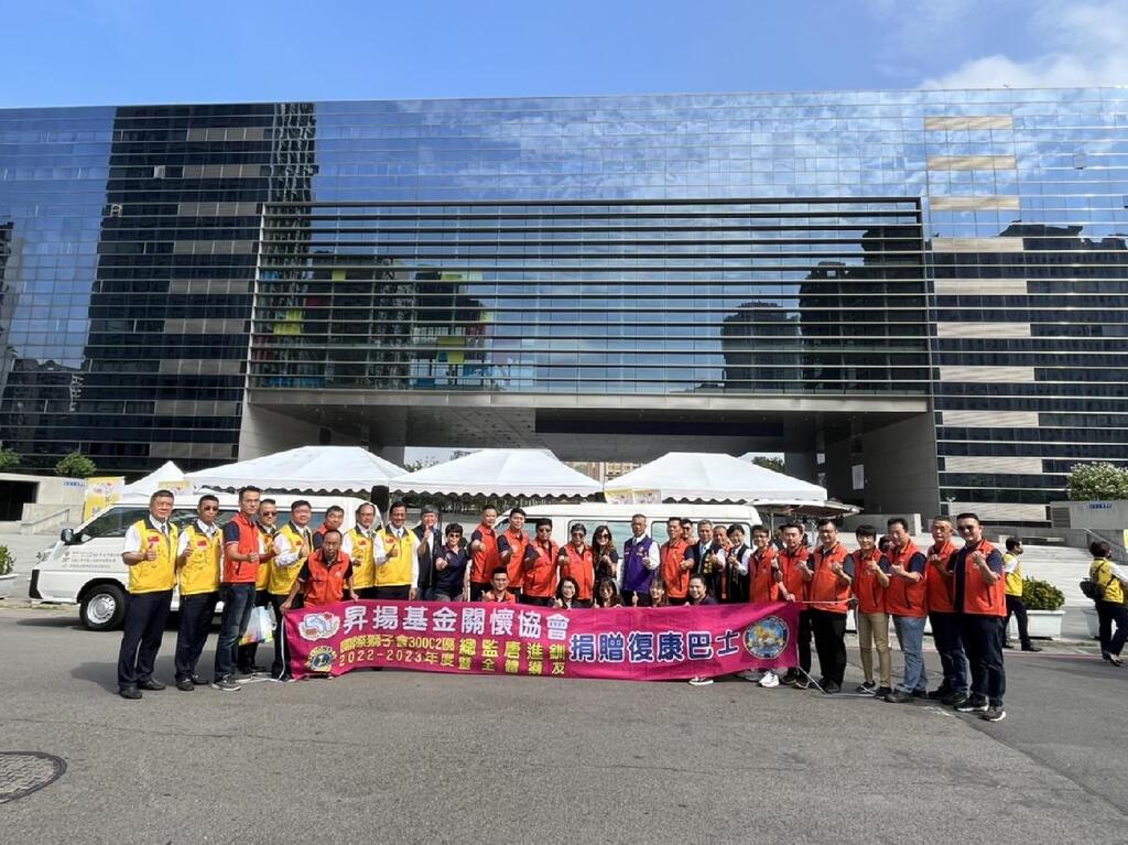 昇揚基金關懷協會攜手國際獅子會300-C2區、昇揚金屬股份有限公司及百晟工具有限公司,今(16)日捐贈台中市政府2輛復康巴士,並在府後廣場舉辦捐贈儀式,社會局長彭懷真出席致意,感謝企業熱心公益,讓身障朋友出外更便利與安全。