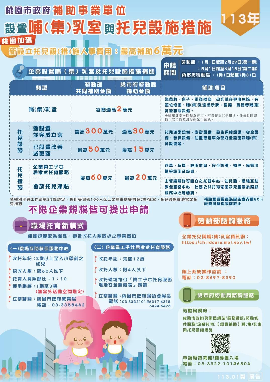 申請補助企業設置哺集乳室及托兒設(措)施,第二階段補助5月1日起,不限事業單位規模皆可提出,哺(集)乳室最高補助2萬元;雇主提供托兒津貼或設置企業員工子女居家式托育服務,每年最高補助60萬元;雇主新設置托兒設施(包括托嬰中心、幼兒園、職場互助教保中心)最高補助300萬元。今(113)年桃園市政府再加碼提供「教保服務人員或托育人員人事費用」最高6萬元補助,歡迎符合資格之事業單位踴躍申請。