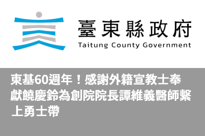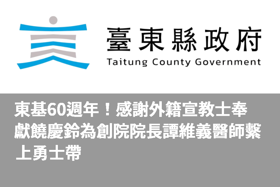 臺東基督教醫院60週年慶,縣長饒慶鈴今(11)日應邀參加成功診所「以愛傳承」活動,為宣教士代表、東基創院院長譚維義醫師繫上勇士帶,感謝過往宣教士對臺東付出的愛、及東基60年來以豐富的醫療資源與經驗,協助提升縣民平均餘命,提供優質醫療服務。