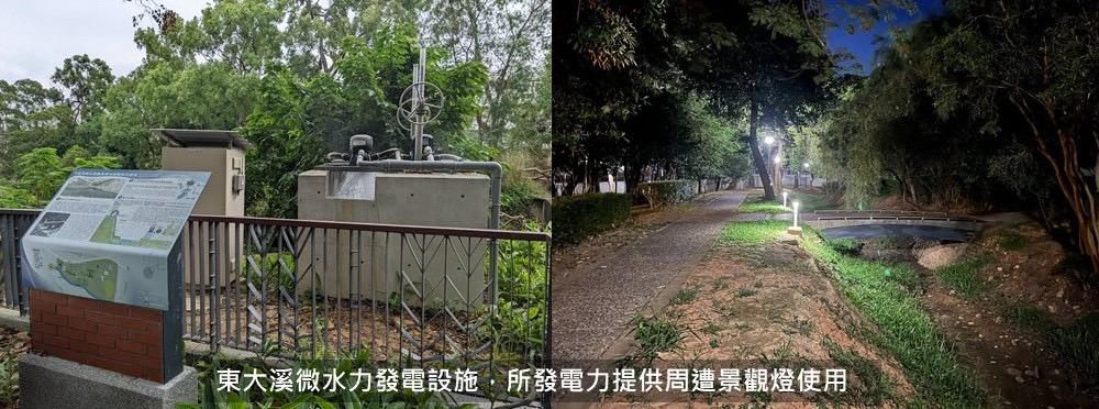水利局表示,為落實綠能綠電開發政策,水利局於110年東大溪水環境計畫中,藉由地形高差將水質處理的礫間淨化水以專管重力排放方式設置一示範性質的微水力發電設施,一天約可產生30度電力供周遭景觀燈使用,同時作為環境教育素材。
