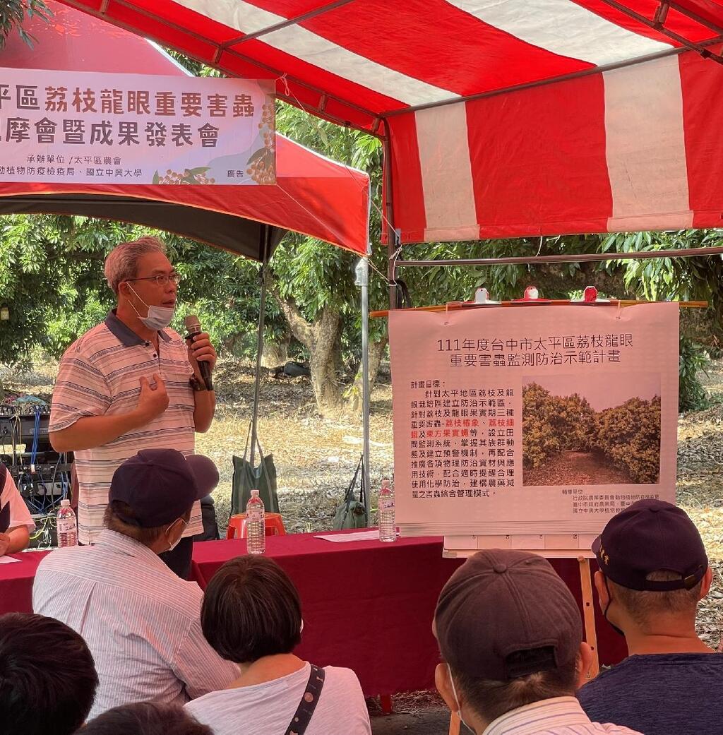 台中市政府農業局輔導太平區農會,攜手國立中興大學植物教學醫院團隊,今(17)日辦理太平區荔枝及龍眼重要害蟲綜合防治成果發表暨示範觀摩會,通過預防、監測及防治等措施,針對荔枝椿象、荔枝細蛾及東方果實蠅等害蟲管理計畫,期讓農友更加了解並採用有害生物綜合管理(IPM)模式,達提高荔枝及龍眼品質安全與農藥減量目的。