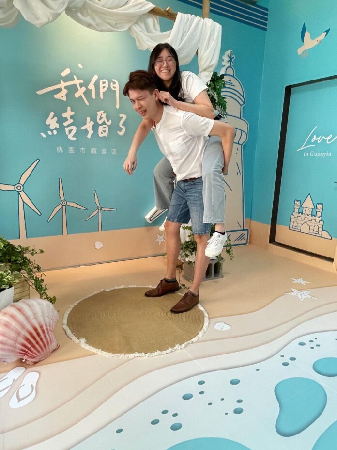 「這就是我們認識的海灘!」,新人陳先生和黃小姐興奮的說。黃小姐回憶,5年前,他們一起參加公司的淨灘活動,海邊又冷風又大,當天她身體不舒服,當時還是同事的老公,一路陪伴、細心照顧,因此開啟了兩人的緣分。兩人是第一對結婚專區拍照的新人,登記當天看到以觀音海岸為主題的結婚背板,瞬間勾起他們相識的過程,直呼實在太巧,開心的在背板拍照前拍照,留下珍貴紀念。
