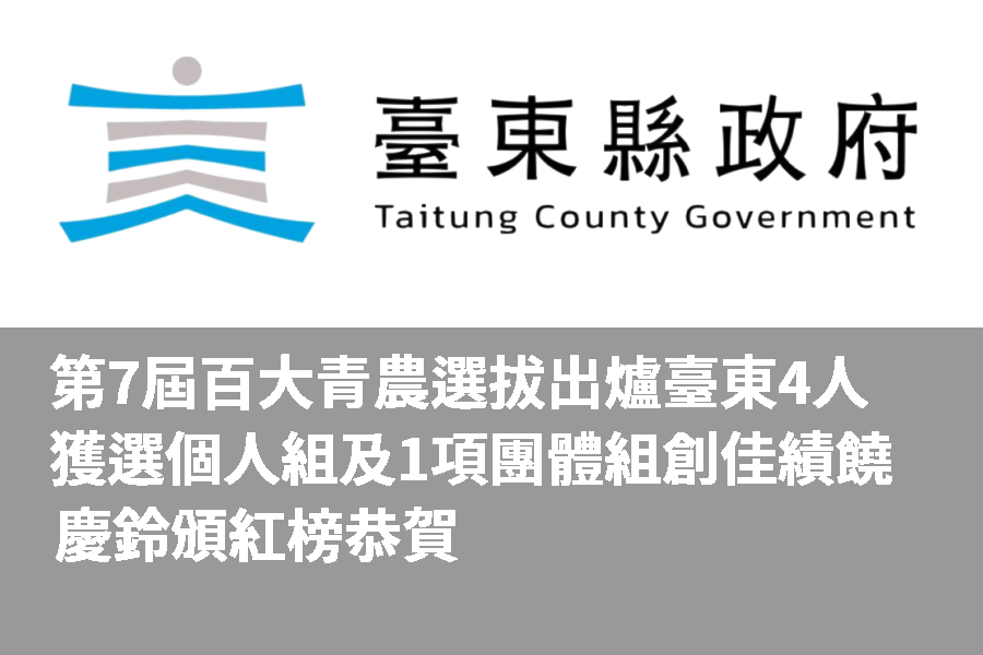 第7屆百大青農選拔名單出爐,臺東縣青農林彥均、林沛縈、張勝堯及簡睿宏等4人獲選個人組,團體組則由范植勛、范植巽、范植皙等三位青年農民(關山鎮梓園碾米工廠)獲選,縣長饒慶鈴讚譽青農優秀表現,並指派農業處長江慧卿及同仁前往獲獎青農家中張貼紅榜表達祝賀,除肯定獲選青農的成果外,也期許獲選青農能持續精進努力,並帶動其他青年農民共榮發展,以發揮漣漪效益。