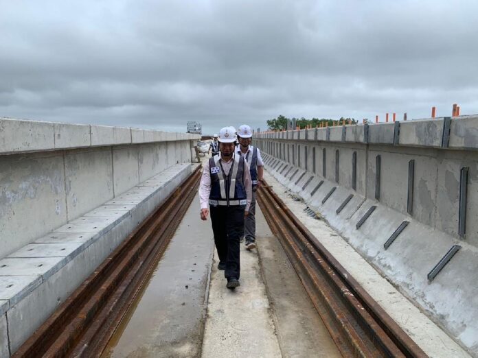 桃園市政府捷運工程局於今(113)427日完成捷運綠線高架段工程主線合龍吊裝,劉慶豐局長今(22)日率領捷運工程局內各單位同仁近40人,以步行近8公里方式,逐步進行捷運綠線高架段土建統包工程北段成果視察,除了檢視已施作完成的橋梁及車站工程,更進一步檢討後續軌道及機電系統工程施作規畫與進度。