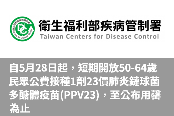 自5月28日起,短期開放50-64歲民眾公費接種1劑23價肺炎鏈球菌多醣體疫苗(PPV23),至公布用罄為止