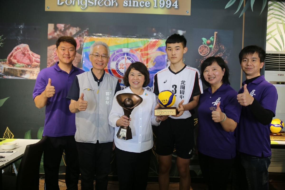 嘉義市北園國中參加「112學年度國民中學排球乙級聯賽」榮獲季軍,刷新隊史及嘉義市參賽最佳成績,更是前八名唯一非體育班球隊。嘉義市政府為表揚北園國中選手及教練的優秀表現並慰勞辛苦的付出,特於昨(28)日於龍師牛排舉辦慶功宴,由嘉義市黃敏惠市長親自表達恭喜,並肯定普通班球隊必須兼顧課業與訓練,以及承受更大的時間壓力和身心考驗,才能從全國排球勁旅中脫穎而出。 黃敏惠市長表示,市府除鼓勵愛運動孩子勇於挑戰外,每年也補助運動社團及體育重點發展經費,提供實質後盾。市府也積極爭取中央補助修繕北園國中排球場天花板及空調汰換工程,總經費近千萬,未來將持續打造優質運動環境,陪伴嘉市學子為嘉義市續寫體壇佳績。北園國中校長謝宜岑表示,感謝市府持續挹注體育發展資源,健全運動場域。此次季軍佳績,除了凸顯排球精神就是北園精神外,未來更將規劃國際交流,讓世界看到北園國中排球隊的熱情與實力。 有球員感動和黃敏惠市長分享,國中前沒有接觸過排球的他,因為社團認識排球,因為球員彼此們的好感情讓他想更努力追上同儕腳步。也有球員提到,去年北園國中在乙級聯賽止步16強,雖然歷經挫折,但球員間相互鼓勵、不斷追求進步,成為今年能創下紀錄的原因。 慶功宴上,市府特別準備排球造型紀念獎座贈送給每位隊員,球員們則將精心準備的卡片及花束獻給市長,預祝勇媽市長母親節快樂。球員賴冠文也分享從初賽一路走來的心路歷程,大家不斷調整應戰心態及進攻節奏,強化場上抗壓力,只要球未落地就還有逆轉的可能,從在意得失到享受球賽,全然相信隊友並互相鼓勵,這次能獲得好成績,就是大家團結合作的成果!