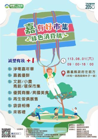 集結再生家具展售、嘉義優鮮、文創、青創、特色商圈、異國美食及環保等超過100個攤位的「嘉有好市集-綠色消費購」,將於6月1日上午9點在熟悉的老地方-嘉義縣政府左前方舉行,配合世界環境日減塑行動特別推出「來客禮」、「滿額禮」等好康,邀鄉親周末逛市集,享受假日時光。