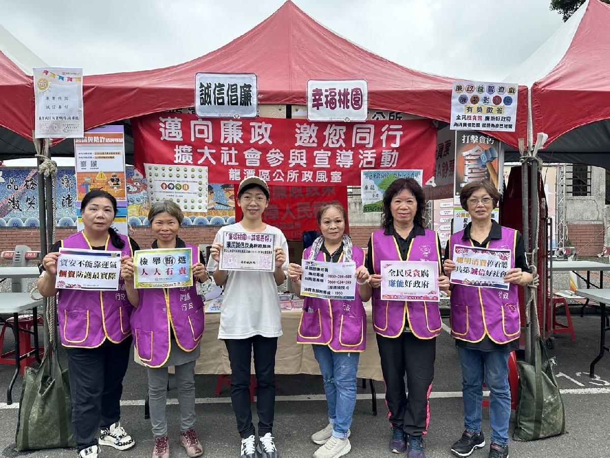 龍潭區公所政風室為強化民眾對於反賄選與反貪腐的認知,結合本次活動設置「廉潔對碰樂」廉政宣導攤位,針對「反貪、反賄、消費者保護」等主題設計益智卡牌對應遊戲,透過淺顯易懂的情境題目,與民眾互動問答,並在遊戲的過程中使民眾熟記法務部反賄選檢舉專線,鼓勵民眾拒絕賄選、勇於檢舉。