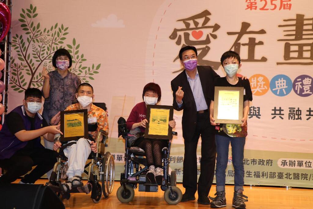 新北市社會局22日在市府大禮堂表揚第25屆「愛在畫中」身心障礙者巡迴畫展得獎者,副市長劉和然代表侯友宜市長頒發獎牌給120名優秀者及5名嚴選組的得獎者。劉和然轉達侯市長的鼓勵表示,新北市是個多元族群的城市,要尊重差異,彼此包容,希望所有得獎者持續創作,用畫筆彩繪出自己的夢想和人生。