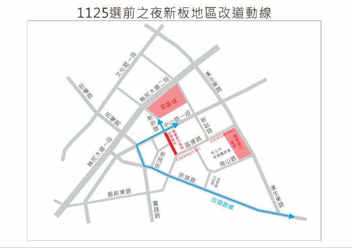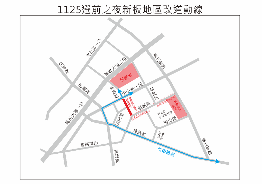 藍綠市長候選人於本週五(25日)分別在板橋第一運動場廣場及新府路舉辦大型集會活動,適逢市民廣場歡樂耶誕城光雕秀,預估新板地區將湧入逾8萬人。交通局將啟動交通戰情室監控車流,周邊主要道路亦將彈性實施交通管制,籲請用路人提早改道,避免壅塞。