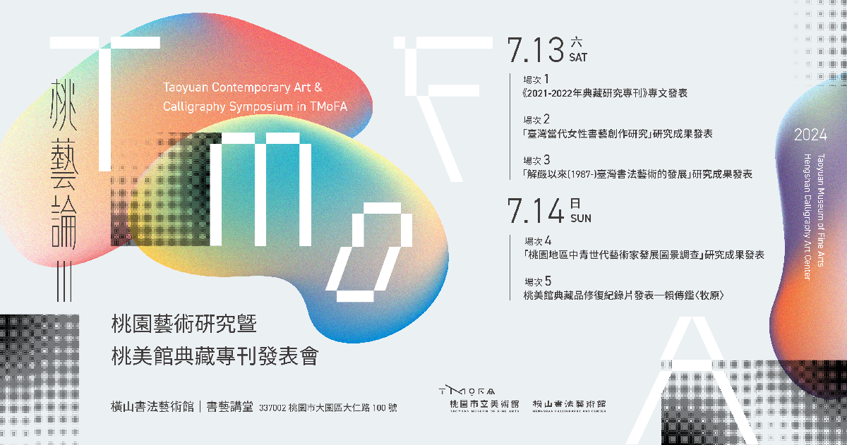 「桃藝論」為桃美館自2021年起,針對桃園藝術生態、書藝發展及美術館典藏品所舉辦之專題研究發表會。在地方藝術研究上,桃美館透過藝術史梳理與分析、訪談與田調等不同取徑,致力勾勒桃園當代藝術與書藝的發展輪廓;在典藏研究上,除了依據館群結構與城市定位進行年度藏品的徵集、研究和出版外,桃美館也持續投入藏品的保存、修護工作。為擴大知識交流層面並分享階段性研究成果,桃美館將於2024年7月13日至14日舉辦「桃藝論III-桃園藝術研究暨桃美館典藏專刊發表會」。