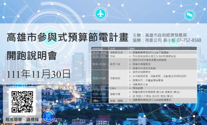 配合中央2050淨零碳排政策,高市府經發局持續積極推動多元節電方案,除深入校園及社區舉辦宣廣教育活動,為找出更具地方特色的節電方案,將於11月30日舉辦「節電參與式預算」說明會,並邀在地商圈及服務業、環保等公協會參與提案,經過專家評比與網路票選,最高可獲20萬元獎金,盼藉由「由下而上」的社會參與,獲得更具節電效益、創意與可行的節電方案,喚醒全民節電意識、共創永續。