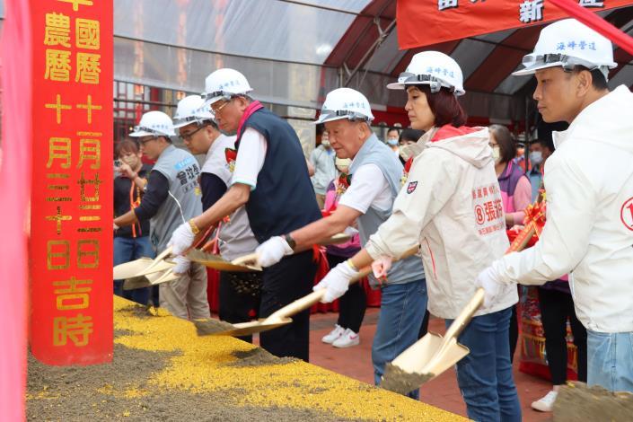 今天上午在頭份市義民廟舉行的開工儀式,由縣長徐耀昌、代表議長鍾東錦出席的議會秘書長林來居、縣議員張淑芬、溫宜靜、黎煥強、徐功凡及陳光軒、曾玟學秘書、頭份市長羅雪珠、市代會主席溫俊勇、義民廟主任委員陳添松、縣府工務處長古明弘、民政處長彭基山、里長等人持鏟動土,並共同焚香祈福工程平安、順利。