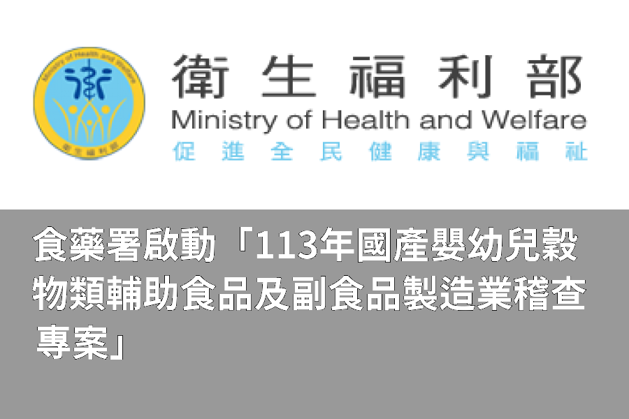 食品藥物管理署近日將啟動「113年國產嬰幼兒穀物類輔助食品及副食品製造業稽查專案」,由衛生機關查核該等製造業者,抽驗穀物原料及成品,維護嬰幼兒飲食安全衛生。
