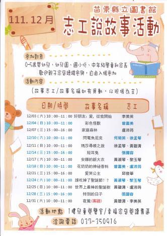 111年12月份志工說故事時間、場次如海報,相關訊息洽詢電話037-350916徐小姐,或上苗栗縣政府全球資訊網-中文網(www.miaoli.gov.tw)-縣府新聞、苗栗縣立圖書館網頁(lib.miaoli.gov.tw)-活動訊息-最新活動查詢。