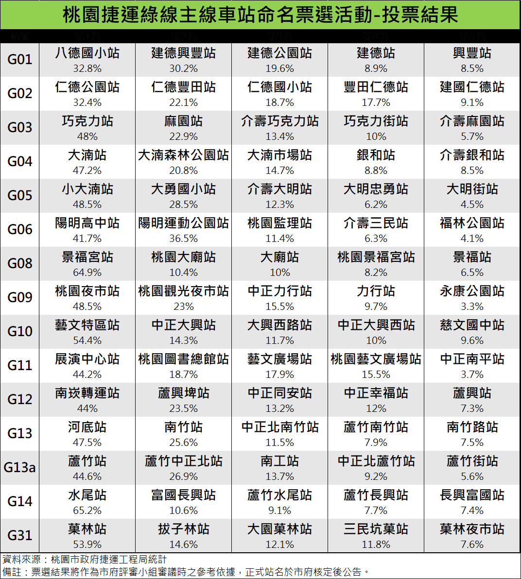 桃園市政府捷運工程局進一步分析,15座車站有7座車站的名稱在第一階段徵名及第二階段票選,都是拿下第1名,可見獲得多數民眾的支持及認同,這7座車站分別是G02仁德公園站、G03巧克力站、G08景福宮站、G09桃園夜市站、G13a蘆竹站、G14水尾站及G31菓林站。