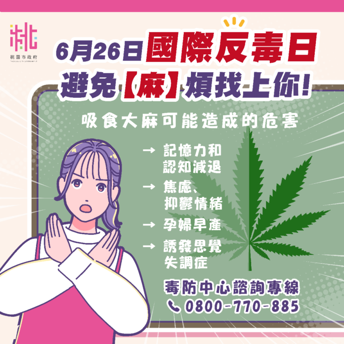 新聞標題常見到大麻相關議題,桃園市政府衛生局藉由626國際反毒日提醒民眾,「大麻」在臺灣是毒品危害防制條例規範的「第二級毒品」,持有、施用(吸食)、栽種、運輸、販賣、轉讓等行為皆有「刑事罪責」,民眾切勿以身試法,避免「麻」煩找上你!有毒品或藥癮問題,請洽詢24小時免付費諮詢專線(0800-770-885),將有專業人員協助。