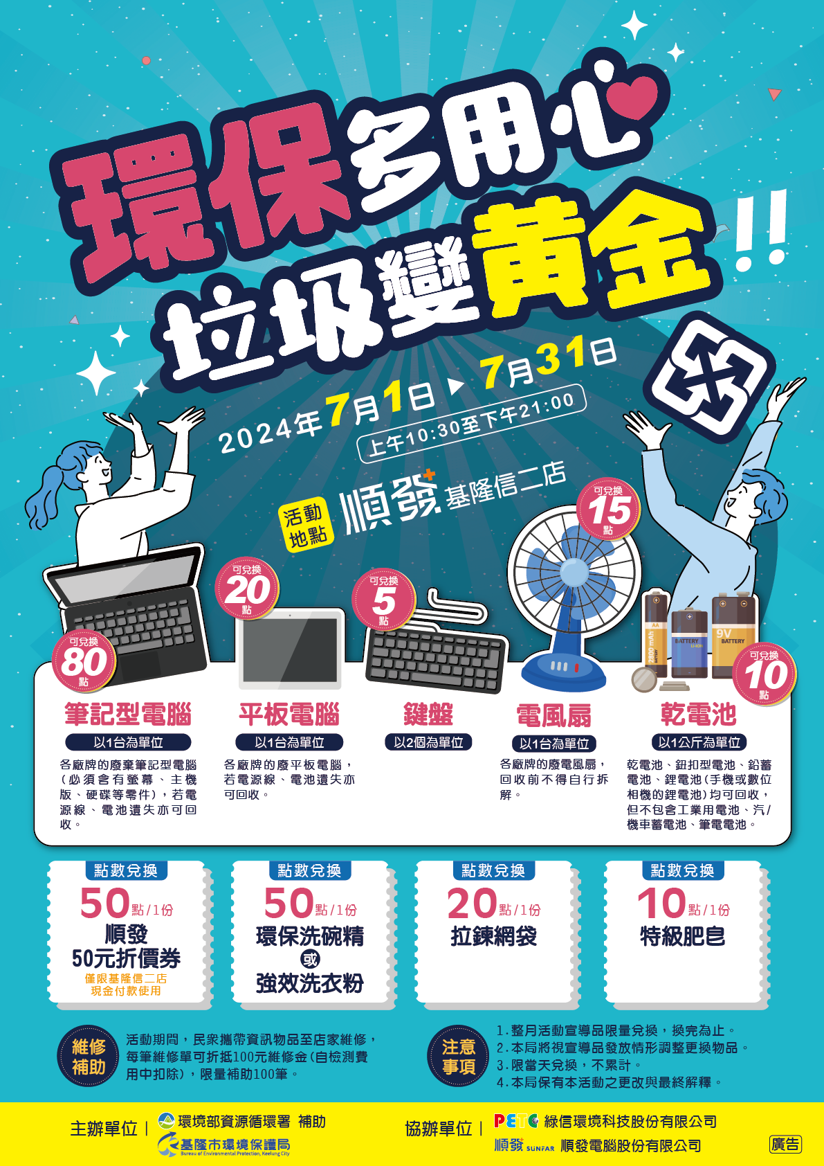 家中不堪使用的筆記型電腦、平板電腦等電子用品千萬別亂丟,基隆市環保局7月1日起至7月31日止與順發基隆信二店合作辦理「環保多用心、垃圾變黃金」回收兌換活動,鼓勵學子勿將不用的電子資訊物品隨意棄置,參加回收兌換活動,一方面可響應環保,另一方面可兌換筆記本、便條紙等,更可兌換順發基隆信二店50元折價券,限量兌換,換完為止!