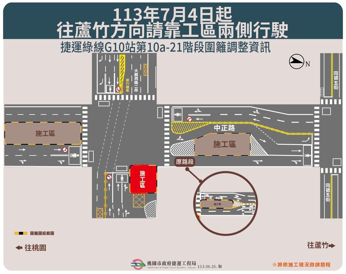 為配合桃園捷運綠線施工,7月4日起進行桃園區中正路(大興西路至同德五街)施工圍籬移設,本次圍籬將往道路東側移設,施工期間仍維持南北雙向各兩個車道通行,往蘆竹方向車輛請靠工區兩側行駛;為避免車流量尖峰造成道路壅塞,建議行經桃園區中正路或者大興西路者,提前改道慈文路、經國路、南平路、莊敬路,若欲往蘆竹中正北路方向行駛者,建議改道富國路、南青路。