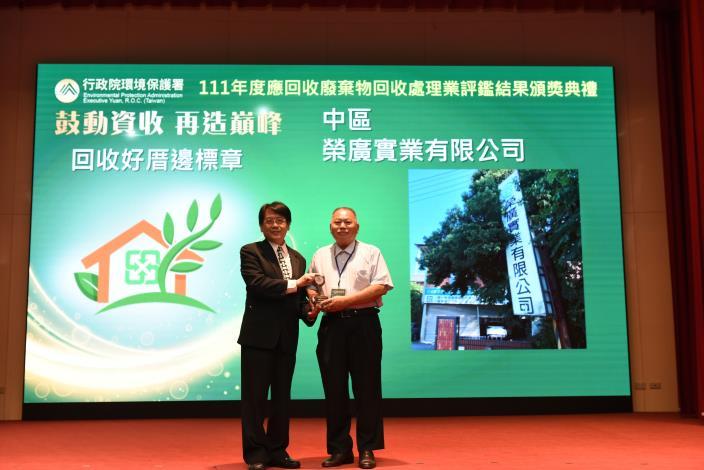 為獎勵獲獎業者,凝聚產業向心力,行政院環保署於111年11月16日舉行頒獎典禮,表揚獲獎業者績優事蹟,本縣共有三家回收處理業者獲選為標竿業者,分別為台灣菸酒股份有限公司獲頒「非塑膠廢容器類資源循環基石標章」、佑順環保有限公司及榮廣實業有限公司獲頒「回收好厝邊標章」,以表揚業者辛勤投入環保工作之貢獻。