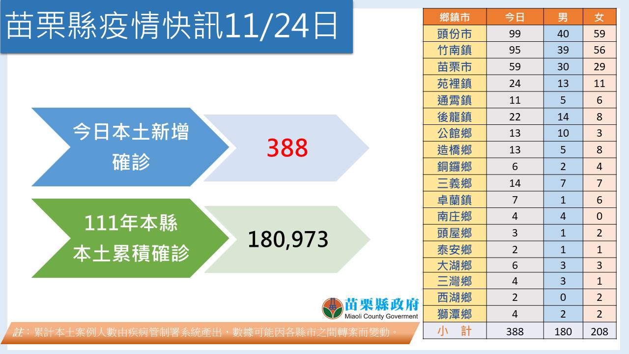 苗栗縣今(11月24日)新增新冠肺炎本土確診388例,其中男性180人、女性208人,年齡分布1歲以下至98歲,分析內容如附圖。自今年1月1日至今天0點,累積本土案例18萬0,973人,人口占比確診率達33.81%。惟疫情多變,防疫不鬆懈。