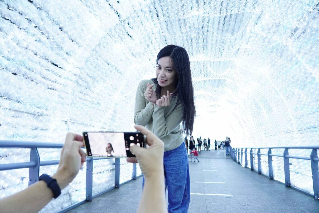 開城之後總是人山人海的雪白燈飾天橋「綺麗光廊(新府路天橋)」,想要拍到好照片,首先得尋找兩側都沒有人站的點位,並使用手機的廣角模式,再借模特兒站姿或向前傾身的位置就能擋住後方遊客,拍出宛若空景般的照片;或是使用手機的人像模式,利用燈飾當前景,帶出局部特寫,也能拍出絕美照片。