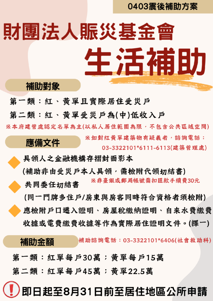 即日起至113年8月31日止,請因本次0403地震建築物被認定為紅、黃單住戶者,得檢附上述應備文件,報送至居住地區公所申請,經區公所完成審核及造冊後,送桃園市政府社會局彙整造冊,提供財團法人賑災基金會辦理後續撥款作業。