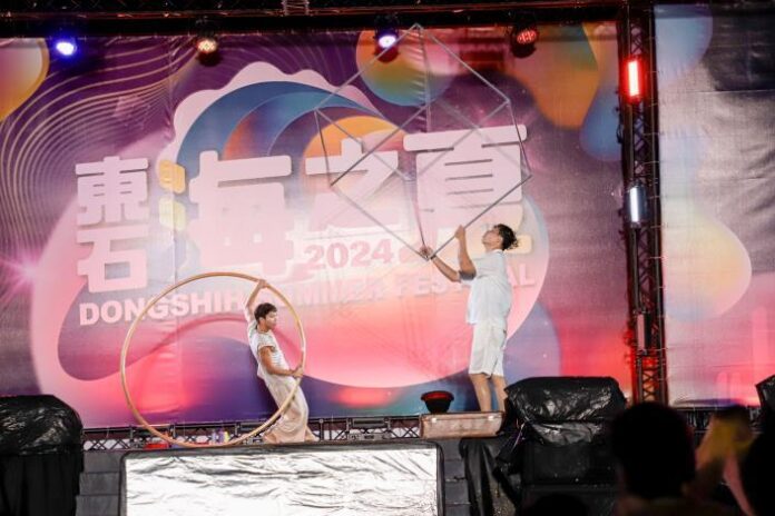 嘉義東石海之夏活動進入第二天,中午已有老饕卡位享用海鮮,下午兩點活動正式登場,包含街頭藝人表演、超大型宇宙航站氣墊及免費DIY體驗,晚間由「狂夢藝術」帶來全台唯一親子互動表演「馬戲書畫秀」,精采演出讓許多遊客大呼精彩。