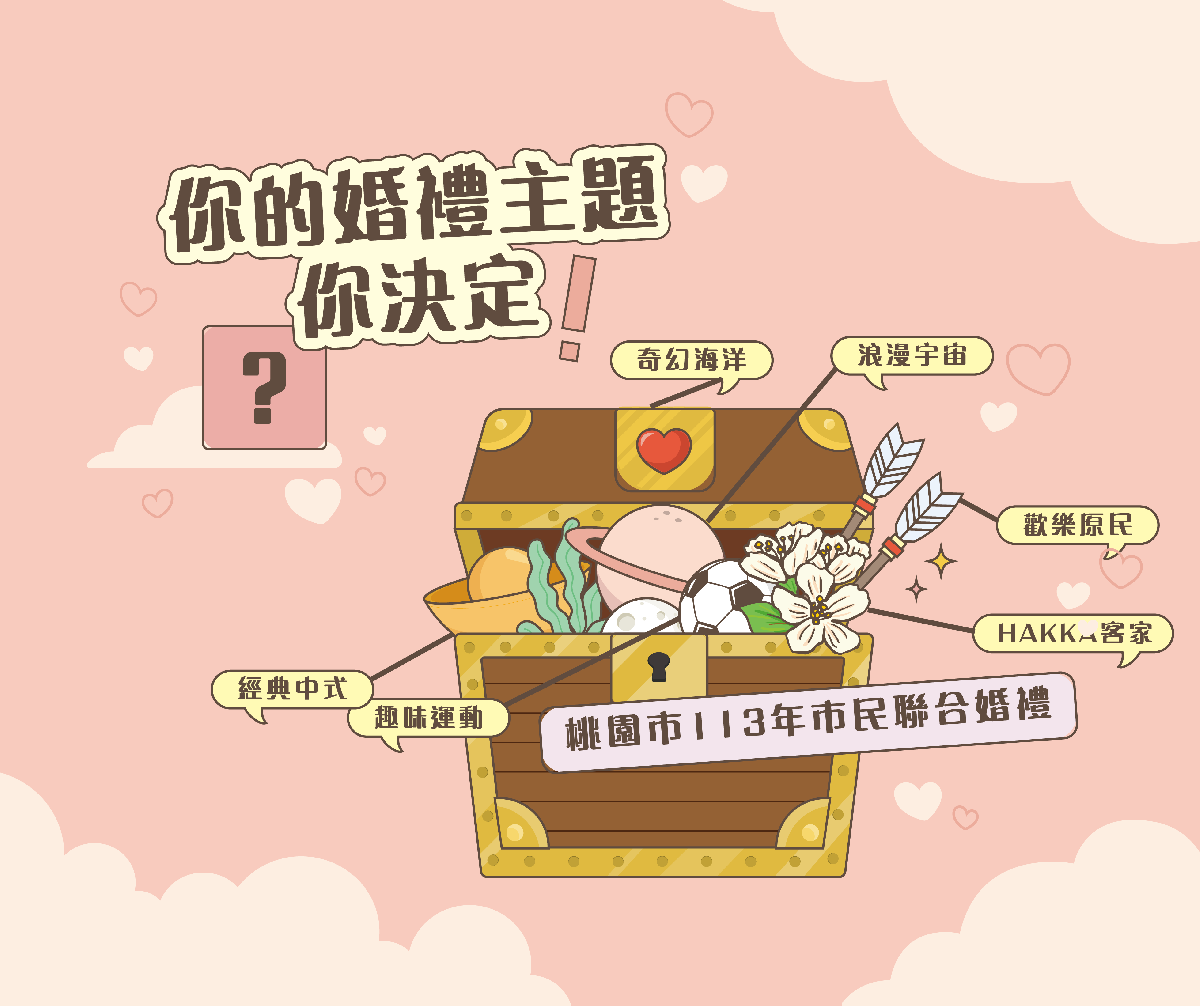 桃園市政府去年舉辦「情定桃園、航向幸福」市民聯合婚禮,以航空主題打造唯美會場,活動開放就秒殺。今年全新推出「你的婚禮你決定!」聯合婚禮主題網路票選活動,提供6大主題讓新人票選。投票時間從即日起到7月31日為止,參加投票還能抽精美小家電。