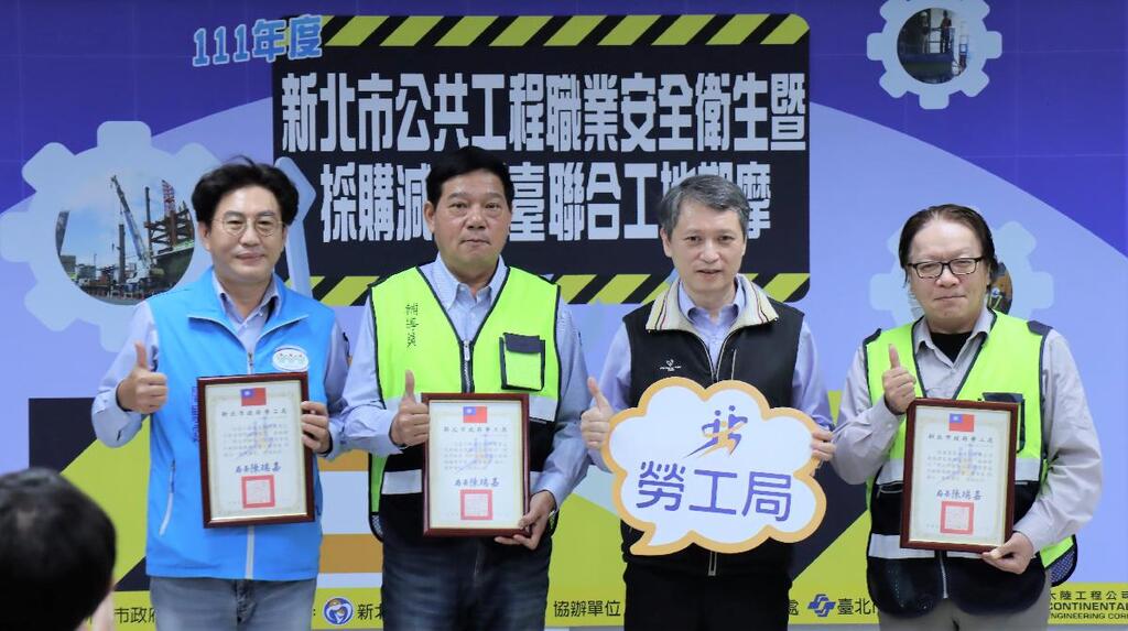另外,今天活動也由陳瑞嘉局長頒獎感謝大陸工程等4家觀摩會協力廠商,泛亞工程協理閻駿霆等3位優良工地輔導員,且與勞動部職安署北區中心、工務局及水利局等機關及全國營造總會、北促會代表進行合影。