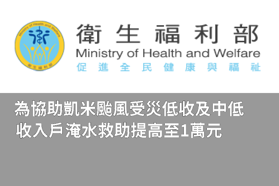 凱米颱風帶來強降雨造成多處災情,配合行政院指示,為減輕低收入戶、中低收入戶受災家庭的負擔,衛生福利部督導所轄公設財團法人賑災基金會,針對低收入戶或中低收入戶家庭,提高補助額度並放寬淹水救助標準,由淹水50公分以上放寬至未達50公分者亦得申請,每戶補助由原新臺幣(以下同)5,000元,提高至1萬元。
