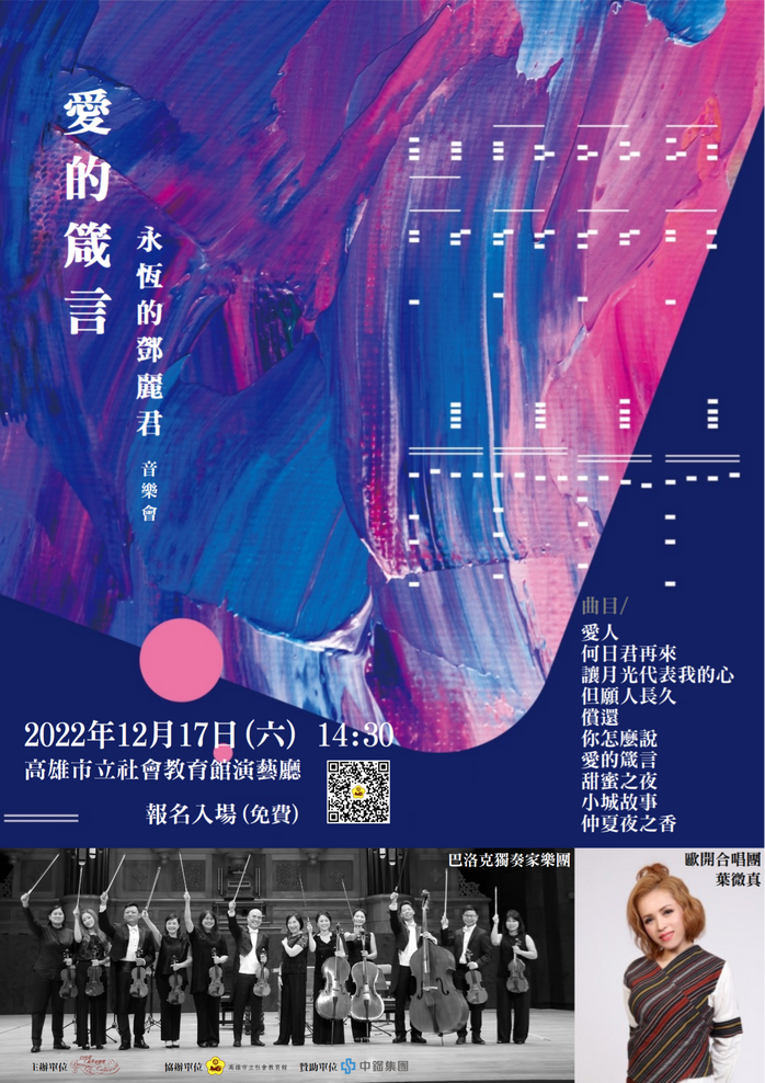 南部新聞高雄市「愛的箴言-永恆的鄧麗君」音樂會,12/17(六)由「巴洛克獨奏家樂團」演奏及「歐開合唱團」首席女高音葉微真精彩演唱,重現鄧麗君風華!本活動由中鋼集團教育基金會贊助並贈送限量摸彩品,歡迎踴躍上網報名參加!
