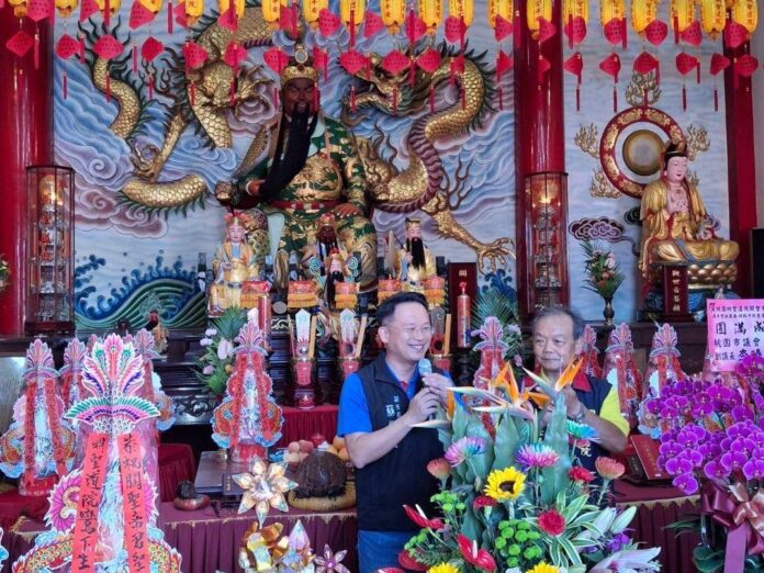 桃園市副市長蘇俊賓今(29)日上午前往桃園區,出席明聖道院「關聖帝君1865年聖誕萬壽大典」活動。蘇副市長表示,感謝明聖道院,不管是在宗教、文化及公益上的付出,今天他代表張善政市長及市府團隊祝賀關聖帝君1,865歲聖誕,也祈求關聖帝君保佑地方平安,澤佑桃園。