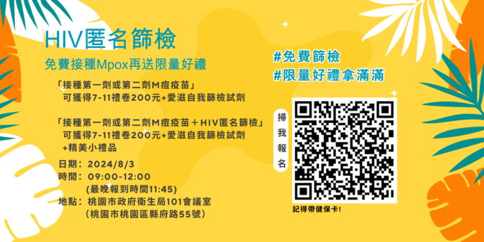 七夕情人節將至,為了提升民眾對愛滋病的認識及預防意識,桃園市政府衛生局8月3日上午9至12時於衛生局1樓特別舉辦一場免費愛滋匿名篩檢諮詢服務,鼓勵大家主動進行篩檢,及早發現、及早治療。此外,現場也設立免費Mpox疫苗接種服務,當天參與者皆享有豐富的好禮,呼籲民眾把握機會踴躍預約參加,享受甜蜜浪漫氣氛同時也注意保護伴侶健康。