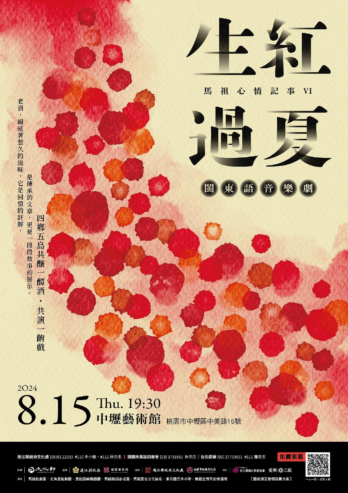 由桃園市政府及連江縣政府合辦之音樂劇「馬祖心情記事」系列閩東語音樂劇第六部《生紅過夏》,將於113年8月15日(星期四)晚上7時30分於中壢藝術館音樂廳盛大登場,以「馬祖人說馬祖故事,唱馬祖歌,演馬祖戲」為製作核心,演出馬祖人的共同記憶,讓這份對馬祖的情意繼續傳遞下去,也讓旅居桃園的馬祖鄉親回味故鄉點滴。