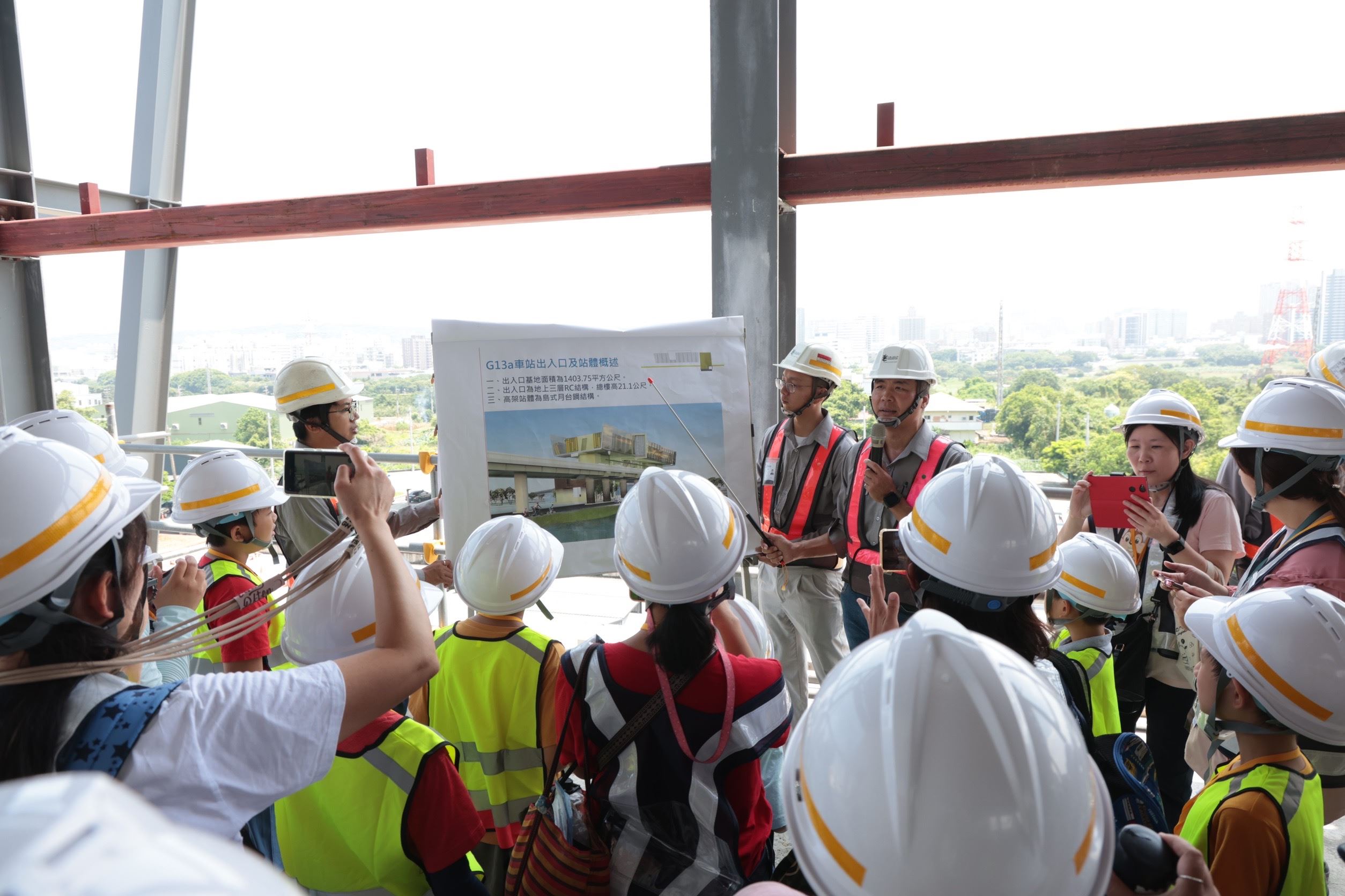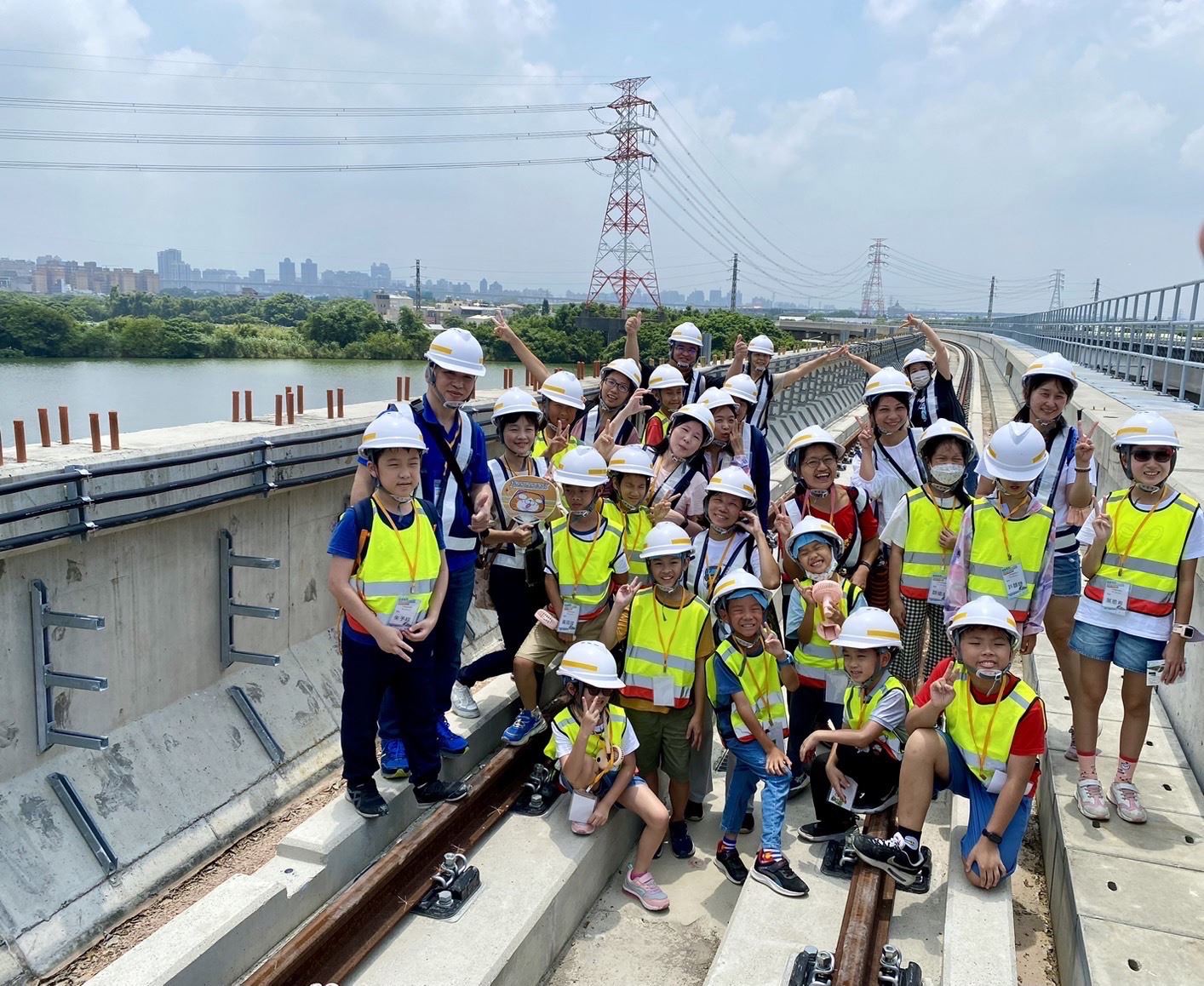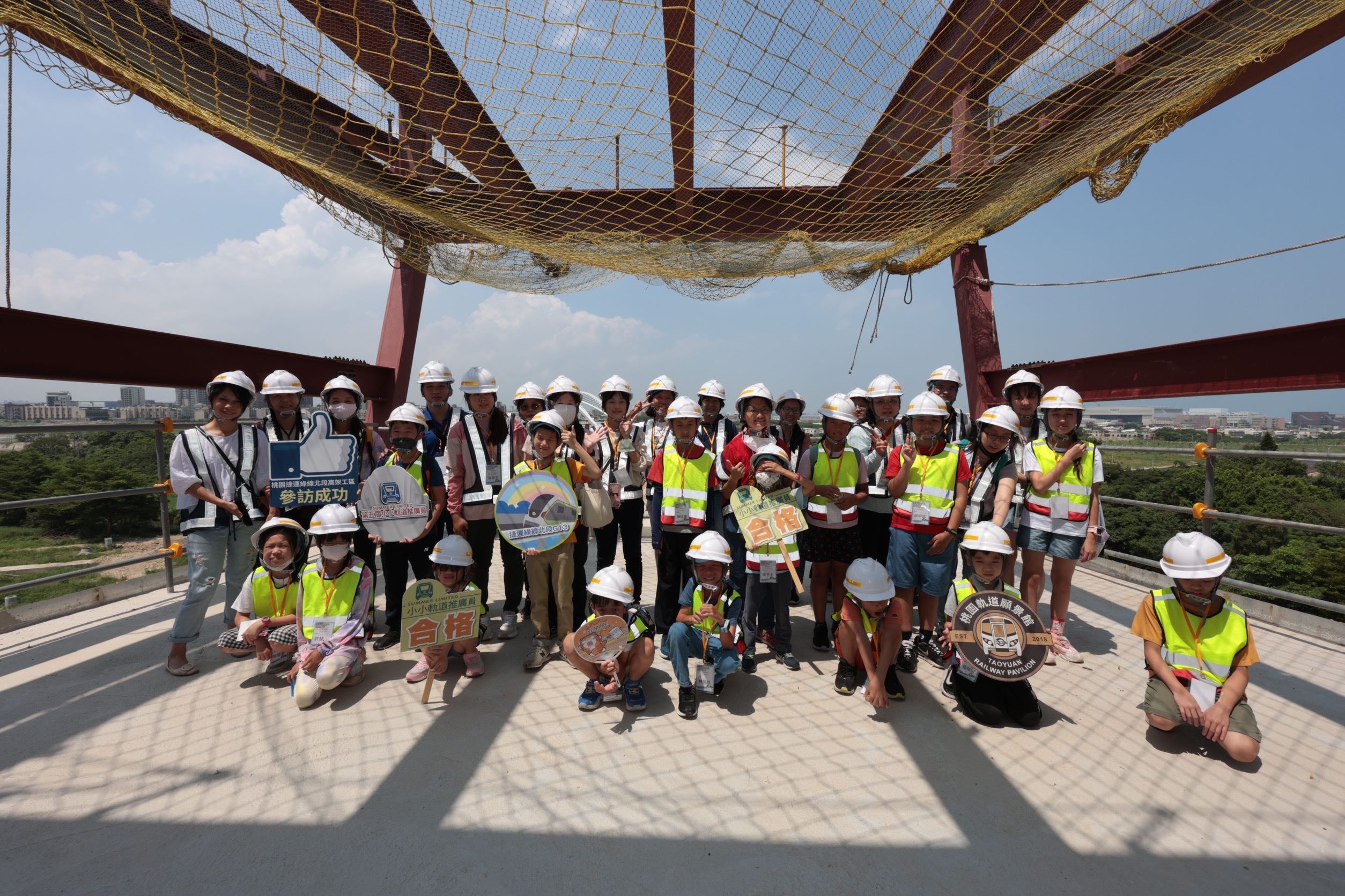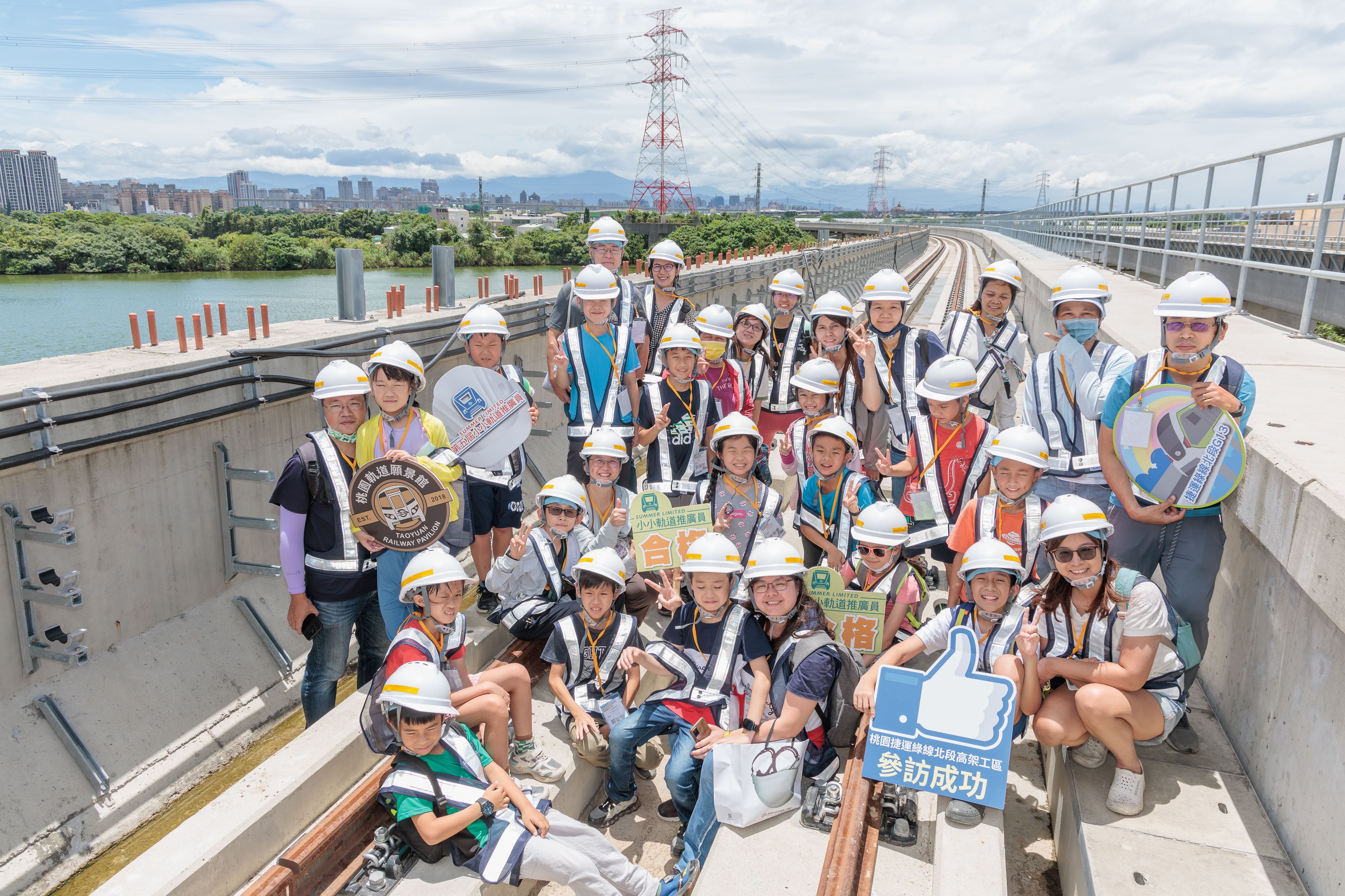 軌道探索隊重頭戲是前往桃園捷運綠線北段高架工區參訪,首先來到已初具雛形的G32車站,由工程師針對捷運站體建築及工程進行簡要說明,並在安全第一原則下,帶領學員進入車站穿堂層參觀,接續來到G13a車站,經由車站穿堂層,再走上G13a車站的高架橋軌道,讓學員們近距離一窺軌道工程,同時也在工區裡留下大小朋友們難掩興奮的合影。桃園市政府捷運工程局劉慶豐局長表示,捷運綠線北段G32至G11車站,以115年為通車目標,目前土建工程的高架與車站結構已趨完成,軌道工程也陸續有階段性成果,下個階段是機電系統施工及測試,正是在這個階段,才有機會安排小小軌道推廣員們走上高架橋軌道。