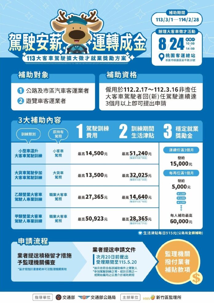 交通部公路局新竹區監理所與桃園市政府合作訂於113年8月24日上午10時於桃園客運總站(桃園市桃園區延平路28號)舉辦「大客車駕駛擴大徵才就業獎勵方案」招募活動,當日邀請桃園客運、亞通客運、亦捷科技、中壢客運、捷乘客運、國光客運、指南客運、臺北客運、三重客運、首都客運、大都會客運,以及葛瑪蘭客運等客運業者設攤招募,預計提供約250個駕駛員職缺,遊覽車業者也提供約30個駕駛員職缺,薪資待遇約4萬5,000元至8萬元不等,還有其他獎金與福利等,薪資條件相當優渥,誠摯邀請有志擔任駕駛員的市民踴躍前往參與。