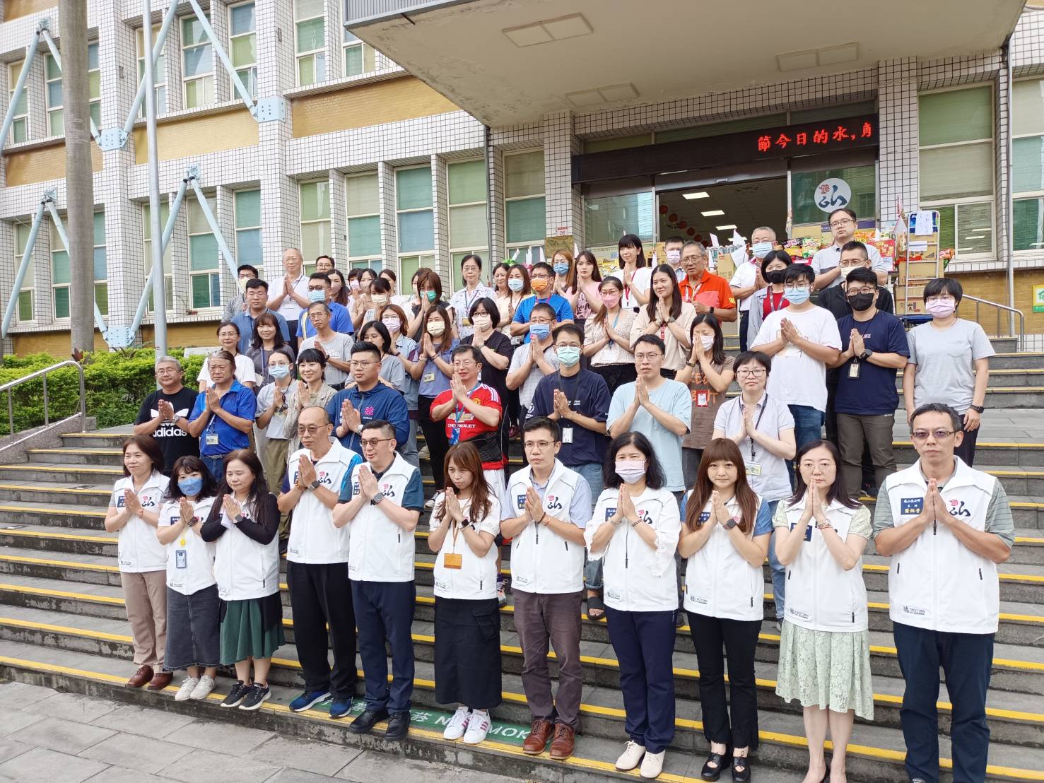 桃園市龜山區公所今日(16)於公所前門辦理113年中元節普渡,由張嘉平區長手持一炷清香,其餘主管及同仁以「雙手」,誠心以鮮花、素果祭拜,共同祈福拜拜,祈求區政業務順遂、風調雨順、同仁闔家平安健康、四時無災,為響應市府環保「新三燒政策」(集中燒、適量燒及替代燒),率先推行環保祭祀措施,期望提升居民環保意識。