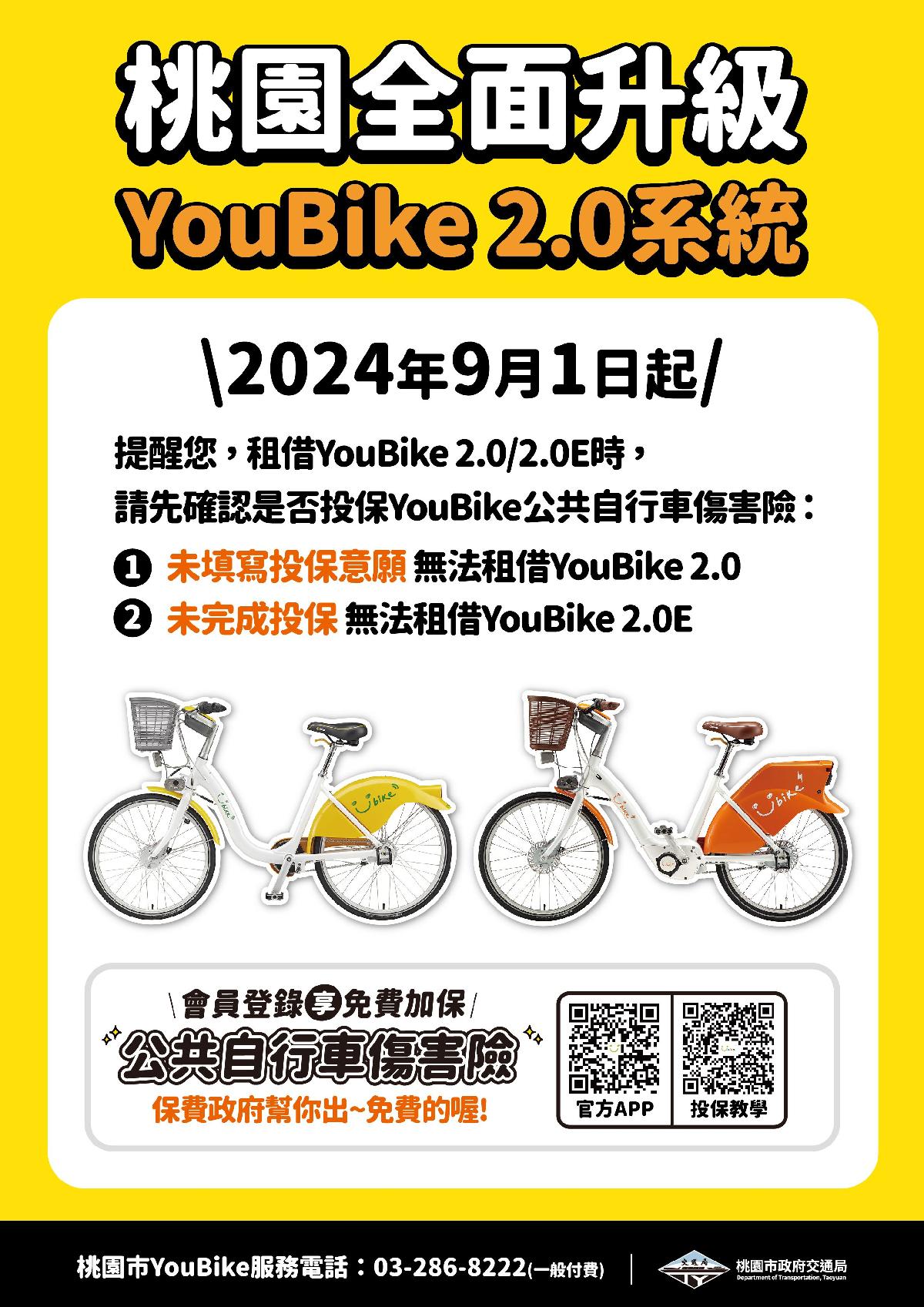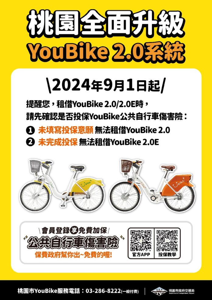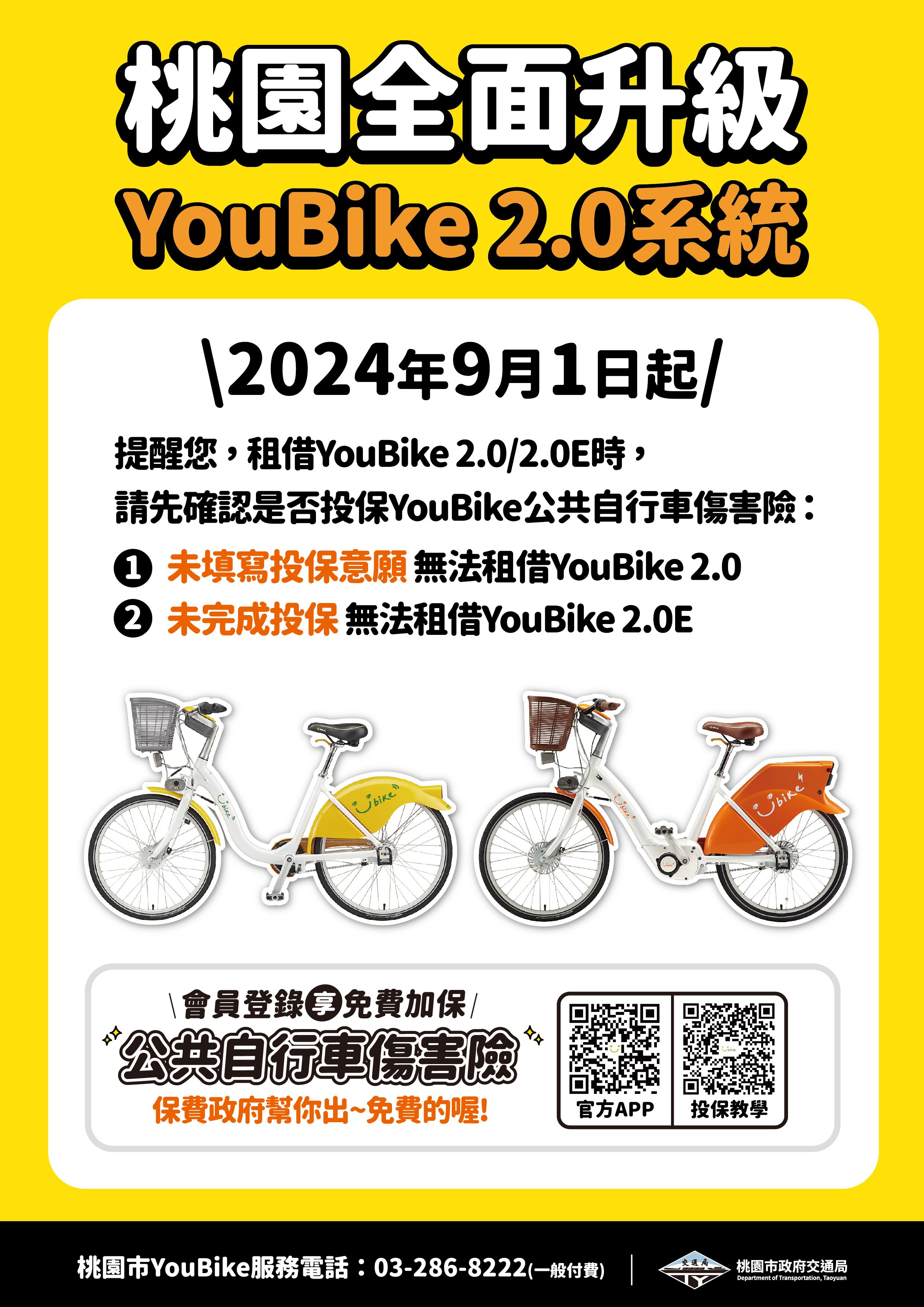 市府呼籲尚未申請免費公共自行車傷害保險之民眾請儘速至桃園YouBike官網或官方App完成投保,避免發生無法借用車輛之情形並為自己多加一份保障;現新制規定會員須「完成投保」才可租借YouBike 2.0E、租借一般車輛(YouBike 2.0)則須「完成投保意願填寫」。