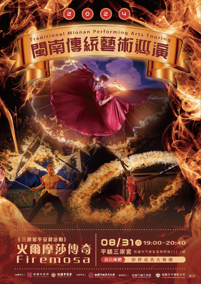 桃園市政府文化局主辦的「2024閩南傳統藝術巡演」,這次來到平鎮三崇宮啦!特別邀請即將成真火舞團,於8月31日晚間7時,在平鎮三崇宮廟埕廣場帶來傳奇兒童火舞劇《火爾摩莎傳奇「FireMosa」》。
