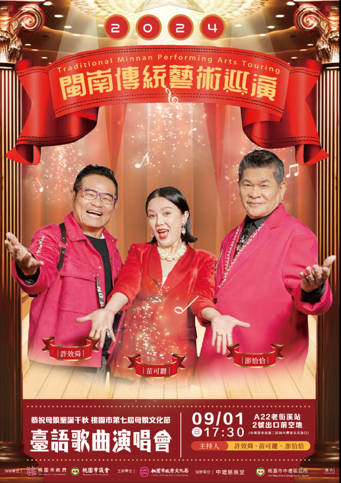 桃園市政府文化局主辦「2024閩南傳統藝術巡演—臺語歌曲演唱會」,將於113年9月1日(日)下午5時30分,在A22老街溪站2號出口前空地(中壢區中美路二段及中豐路交叉路口),熱鬧登場!