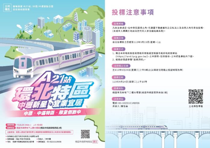 桃園市政府地政局蔡金鐘局長表示,本次規劃釋出40標47筆土地,面積共約5.94公頃,主要將釋出機場捷運A21站地區計34標40筆土地(2筆商業區及38筆住宅區),面積約5.45公頃,鄰近中壢區公所,周邊生活機能完善,且有捷運A21環北站串連機場與高鐵,國道1號中豐交流道刻正新闢中,甚具交通優勢。本次亦一併釋出中壢運動公園生活園區4標5筆住宅區土地,面積約0.16公頃,為包含體育休閒、商業等都會機能的高品質生活圈;另中壢中原營區區段徵收開發案釋出2筆商業區土地,面積約0.33公頃,區內有中原文創園區且鄰近中原大學生活圈,配合鐵路地下化建設亦將新闢中原車站,有意投標者請勿錯過。