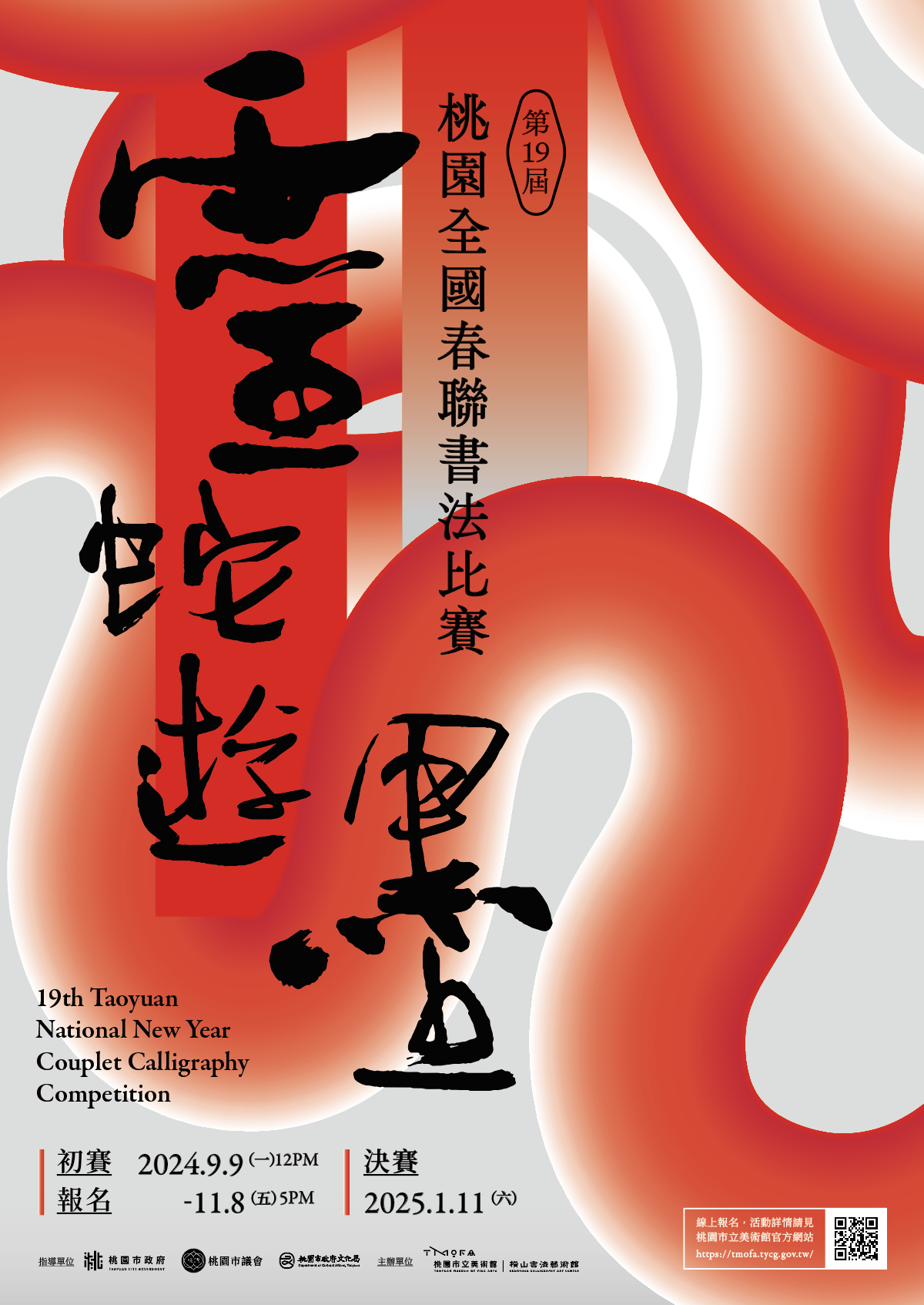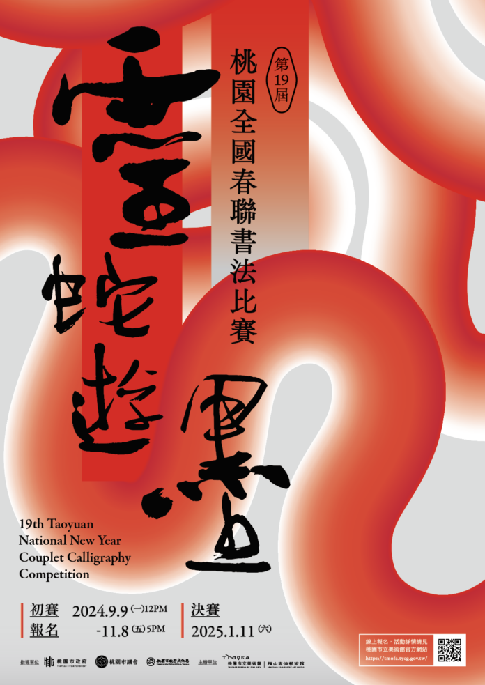 桃園市立美術館(以下簡稱桃美館)為推廣書法藝術、宏揚及傳承書法藝術文化,配合2025蛇年新春,以「靈蛇遊墨」為主題,舉辦「第19屆桃園全國春聯書法比賽」。初賽報名即日中午12時起至11月8日下午5時截止。入選者將於2025年1月11日新春之際進行決賽。本屆比賽總獎金新臺幣60萬4,000元,大專組、社會組、長青組3組首獎獎金高達3萬元,特優以及優選獎金分別獎金提高至1萬元及6,000元。歡迎全國民眾報名參賽,以筆墨渲染濃厚年味,一同體驗書法藝術的樂趣。