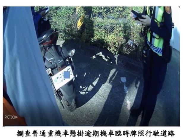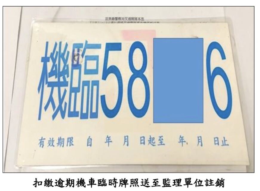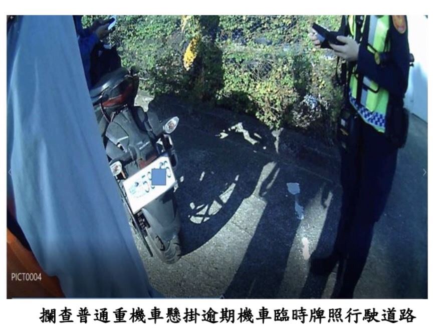 警方與監理、環保單位共同查驗該較為罕見臨時牌照,並核對該機車引擎號碼所登載車籍資料,比對廠牌、款式、顏色及出廠年份均吻合;惟使用期限超過法定五日,已失其效力,當場舉發1件交通違規通知單,並扣繳該牌照送至監理單位執行註銷。