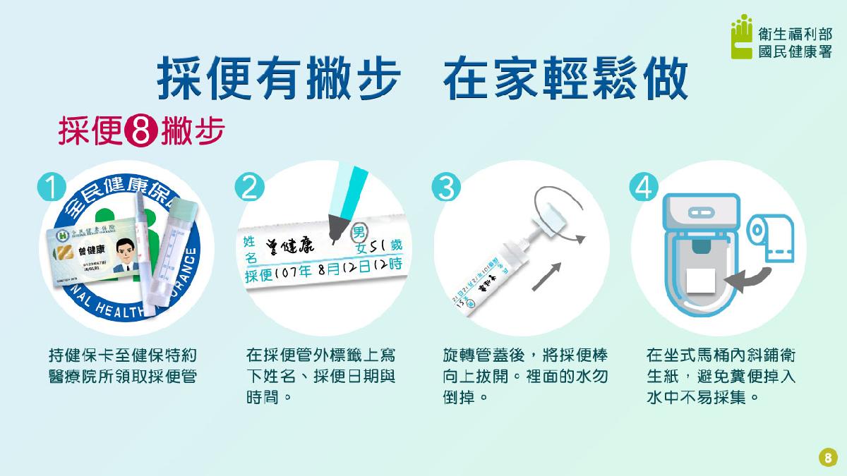 民眾可透過全民健保行動快易通APP查詢是否符合大腸癌篩檢資格(首頁>貼心提醒),並查看最近三次的檢查結果(首頁>檢驗檢查結果>癌症篩檢結果>大腸癌篩檢);也可以透過全國癌症篩檢活動暨醫療院所資訊查詢網站查找附近的癌症篩檢活動或醫療院所資訊,就近領取採便管。糞便潛血檢查無侵入性且不需在檢查前限制飲食,民眾可在家輕鬆完成定期篩檢(採便步驟如附圖)。