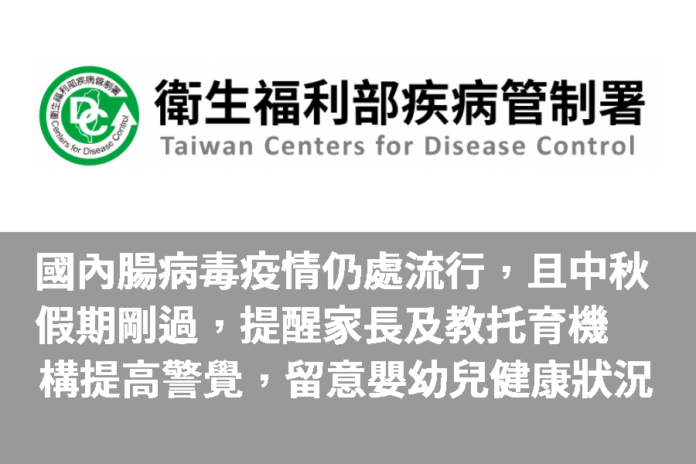 疾病管制署(下稱疾管署)今(18)日表示,國內腸病毒疫情持續,仍高於流行閾值,且中秋假期,親友相聚歡慶佳節,增加病毒傳播及群聚感染風險,提醒家長及教托育機構提高警覺,留意嬰幼兒健康狀況,倘家中嬰幼兒經醫師診斷感染腸病毒,應留意是否出現腸病毒重症前兆病徵,把握治療黃金時間,降低重症風險。腸病毒傳染力強,易於家庭手足間傳播,尤其家有5歲以下嬰幼兒之家庭,應更加注意個人衛生,並時常消毒、清洗兒童常接觸的物品及玩具。