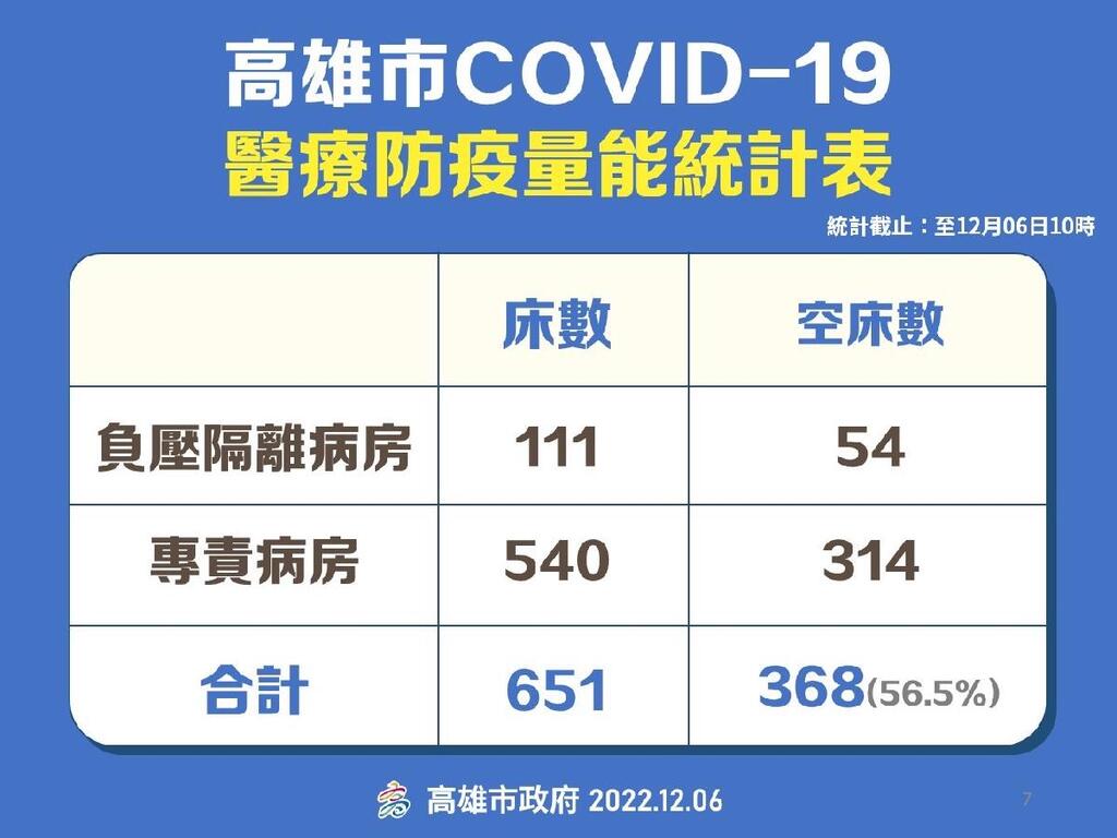 南部新聞高雄市【衛生局】高雄市12/6 COVID-19醫療防疫量能統計
