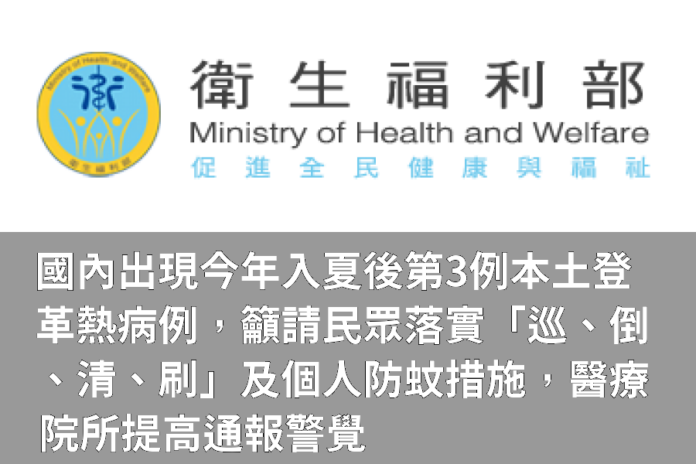 衛生福利國內出現今年入夏後第3例本土登革熱病例,籲請民眾落實「巡、倒、清、刷」及個人防蚊措施,醫療院所提高通報警覺