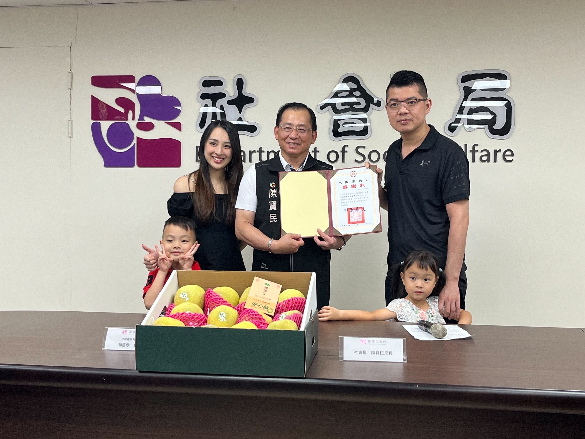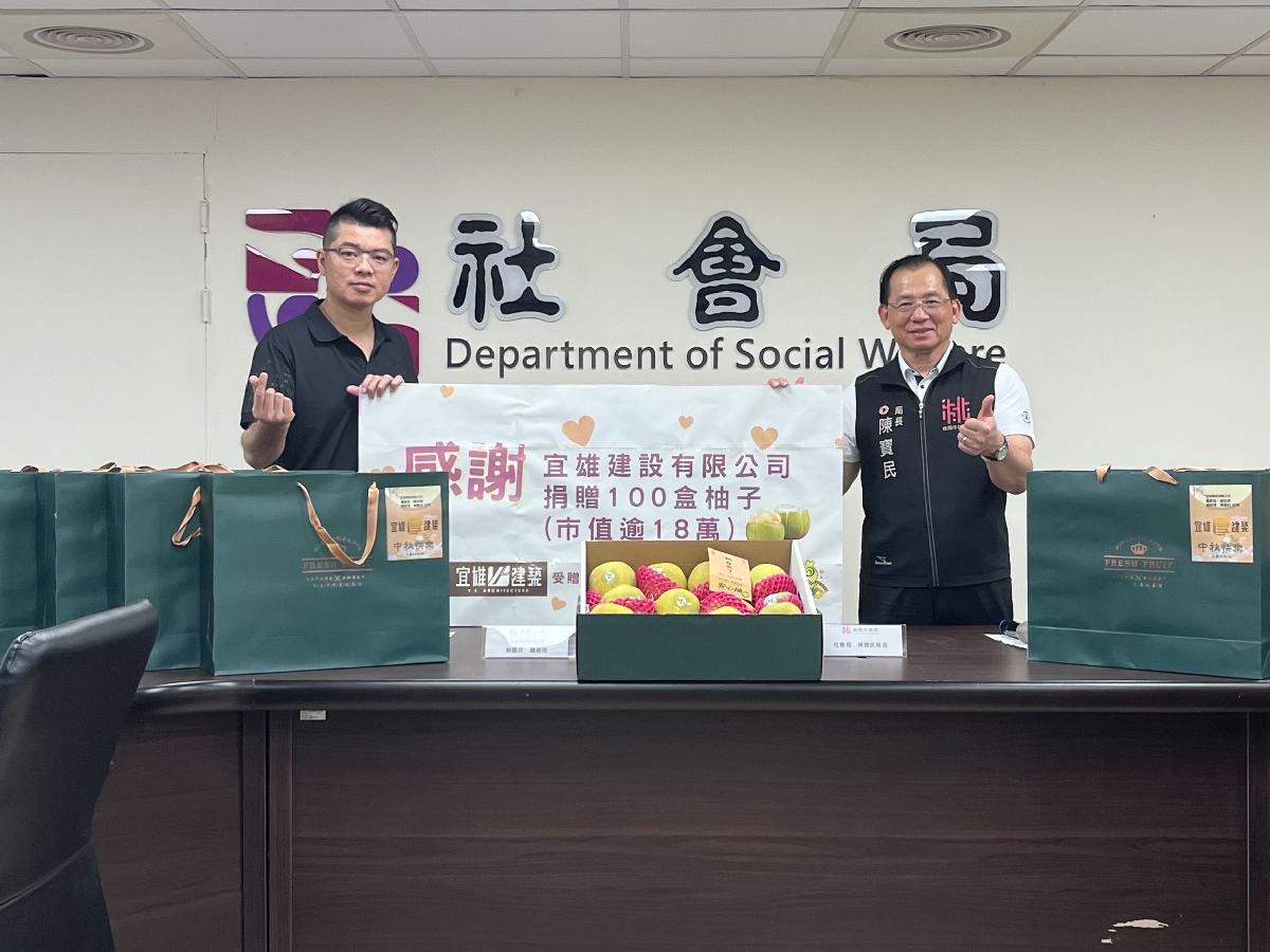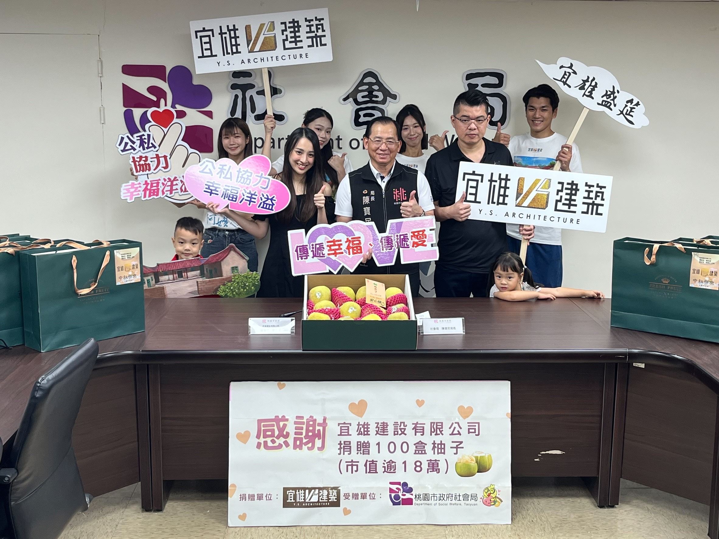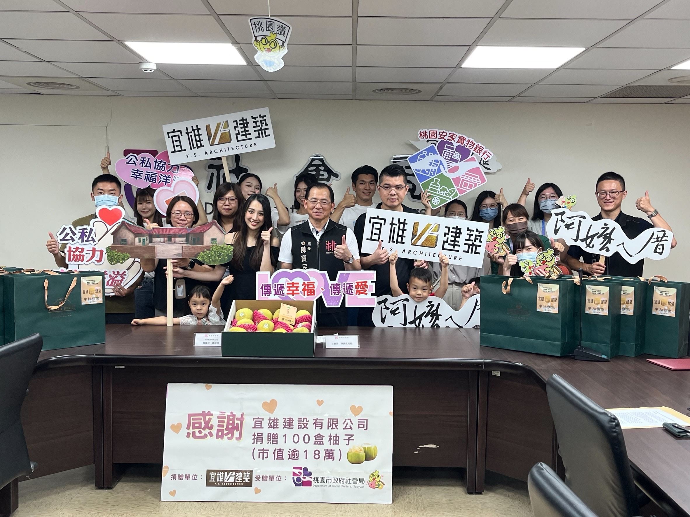 宜雄建設有限公司於中秋前夕捐贈100份柚子禮盒予服務弱勢家戶的第一線社工人員,9月16日下午由該公司賴靈欣總經理率領微電影「阿嬤ㄟ厝」劇組及公司團隊於桃園市政府社會局舉行捐贈儀式,由社會局陳寶民局長代表致贈感謝狀表彰善舉。