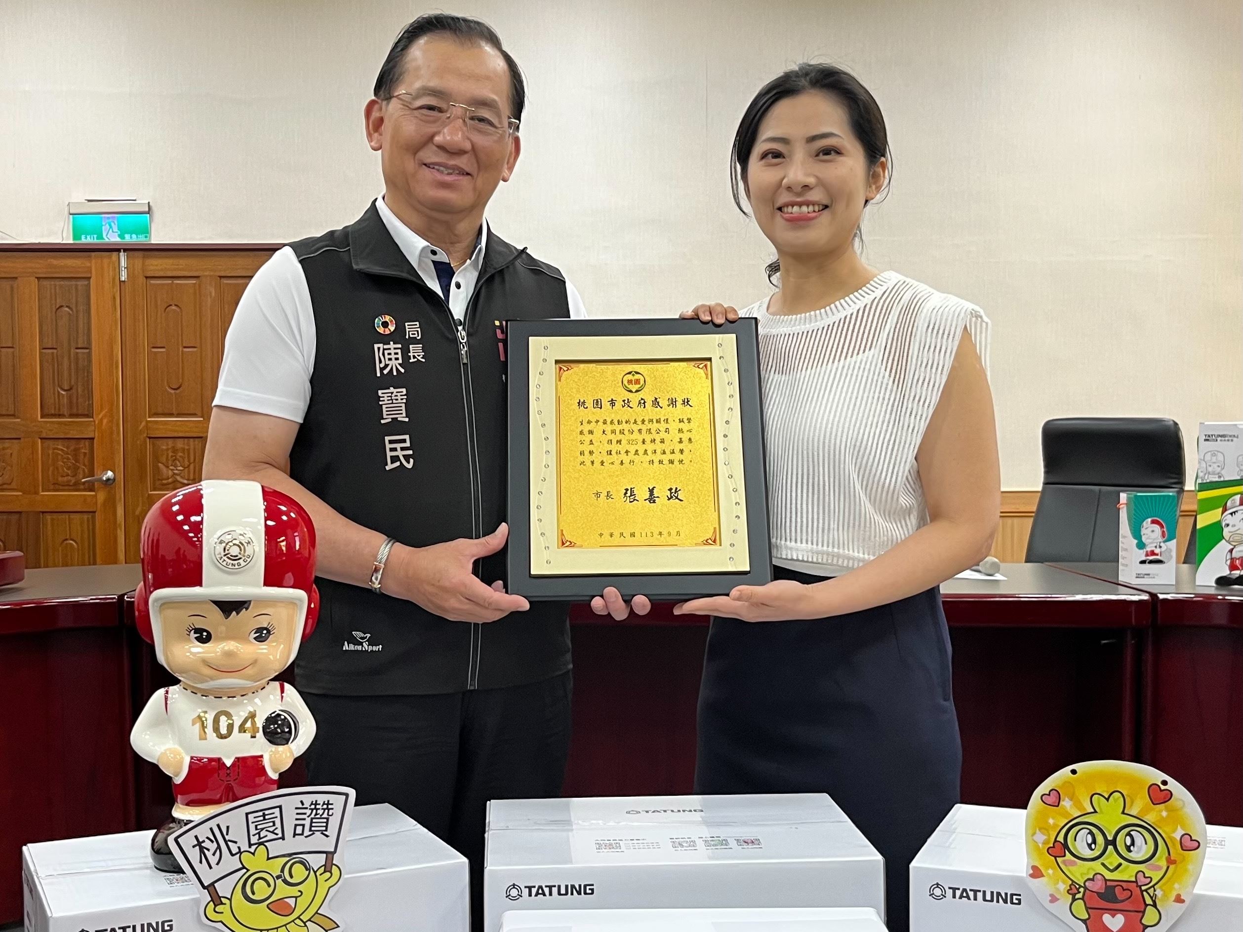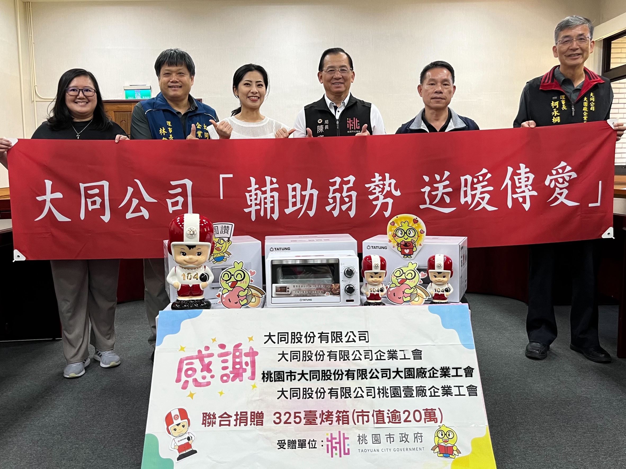 大同股份有限公司捐贈325台烤箱關懷桃園市弱勢家戶,9月13日上午於桃園市政府社會局舉行捐贈儀式,由社會局陳寶民局長代表致贈感謝牌表彰善舉。